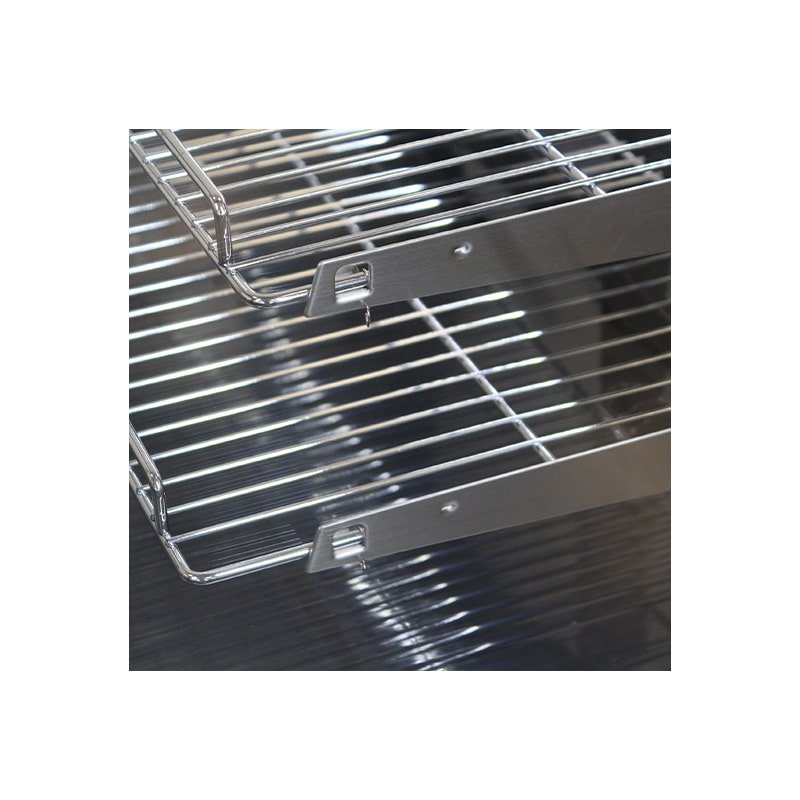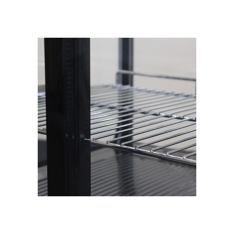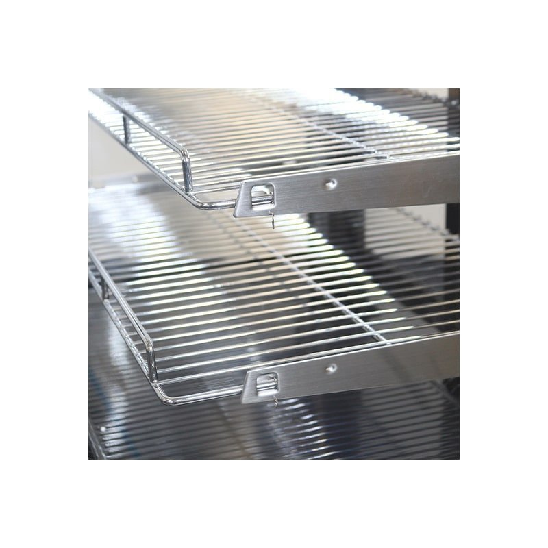 Présentoir à réfrigération ventilée avec dégivrage automatique et barquette à condensation.